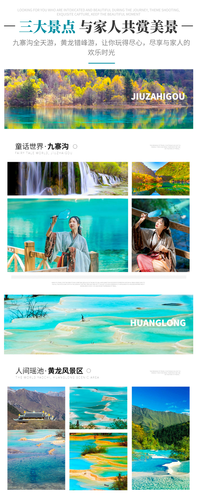 108 个高山湖泊及数十处流泉飞瀑等景观。最奇特的是九寨沟的水,清冽透底,变幻无穷;在阳光的折射和反射下呈现五彩斑斓的色彩,让您细细体味“黄山归来不看山,九寨归来不看水”的意境。